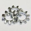 Toothed lock washers resist rotation by "biting" into the the surface. The internal toothed style is more aesthetically pleasing, whilst the external tooth has greater holding power.